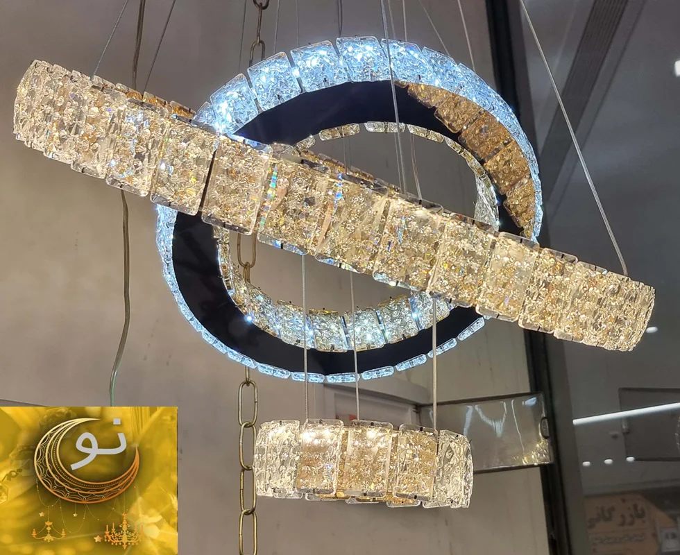 برای مشاهده طرح های متنوع، ارزان و جدیدترینها www.mahnou.ir را ببینید. پیشنهاد ما استیل ضخیم درجه یک با کریستال 3*5 نگینی (تصویر 3) با کیفیت عالی است. لوستر مدرن آویزی کهکشانی 3 حلقه گرد، با هر اندازه درخواستی تولید میشود. شکل ظاهری بصورت کهکشانی یا صاف قابل تنظیم است. محصول دارای 5 سال ضمانت بدنه و 18 ماه گارانتی برقی می باشد (برای کریستال 3*5). این لوستر برای فضای 18 - 15 متر مربع مناسب است و در صورت دوبل کردن نورش تا 30 متر مربع جوابگو می باشد. دارای صفحه استیل گرد سایز 25 cm جهت اتصال به سقف می باشد. کنترل - فلز و ال ای دی SMD و کریستالها همه درجه 1 هستند. آیتمهای اثرگذار بر قیمت: 1- نوع و ضخامت ورق استیل 2- رنگ بدنه (نقره یا طلایی) 3- نوع کریستال 3*5 سانت عکس یک و پنج یا 3*3 سانتی عکس 2و4 می باشد 4- ریموت کنترل هوشمند برای تنظیم روشنایی 5- میزان روشنایی 6- گارانتی کیفیت عالی با کریستال نگینی بعلاوه متفاوت بودن رنگ نور حلقه های مختلف (پیشنهاد ماه نو). برای قیمت ارزانتر و کیفیت پایین تر "ورق استیل نازک، SMD تراکم 180، کریستال درجه 2" تماس بگیرید.